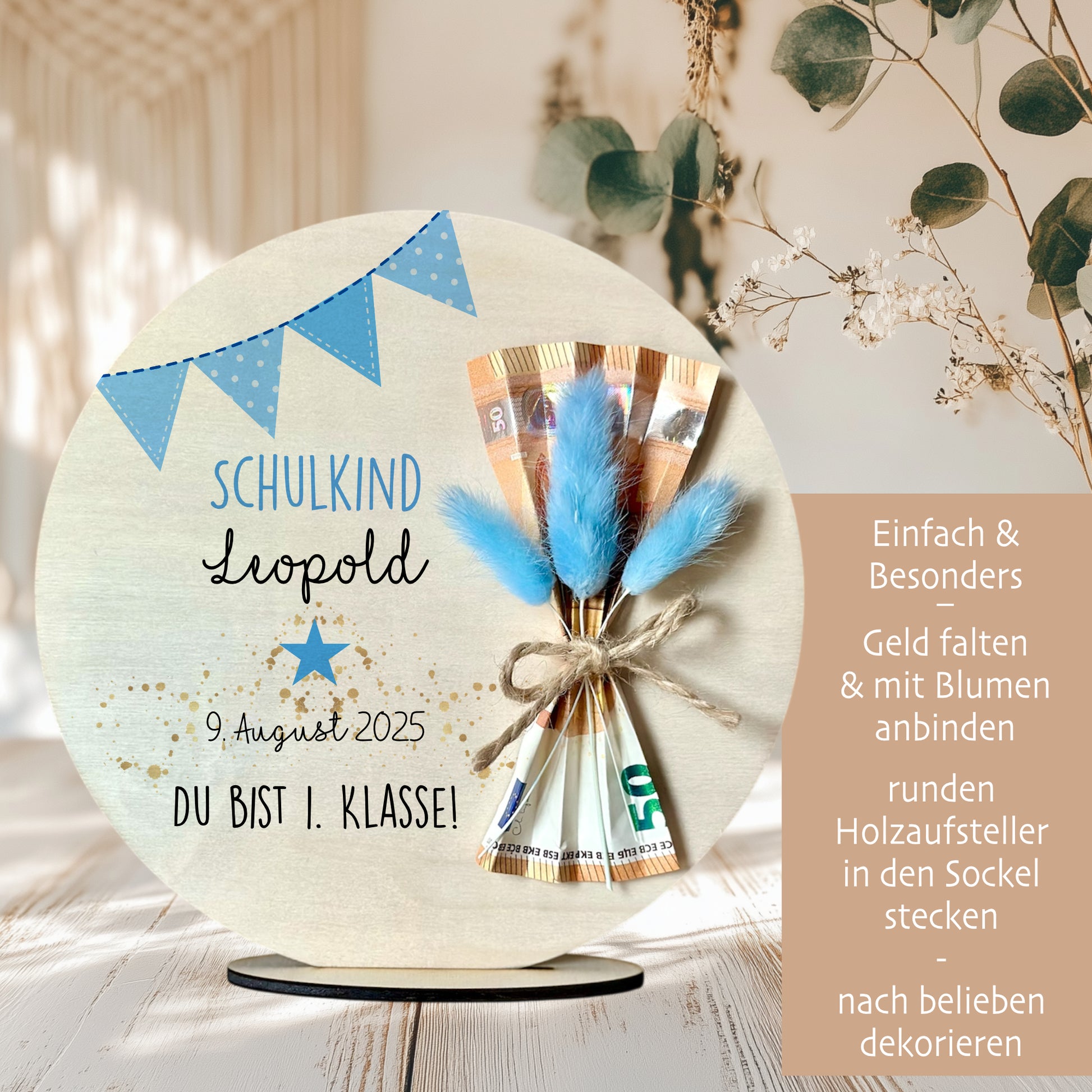 2. Aufsteller platzieren: Setze den runden Holzaufsteller an seinen Platz und präsentiere dein kreatives Geldgeschenk zur Einschulung.
