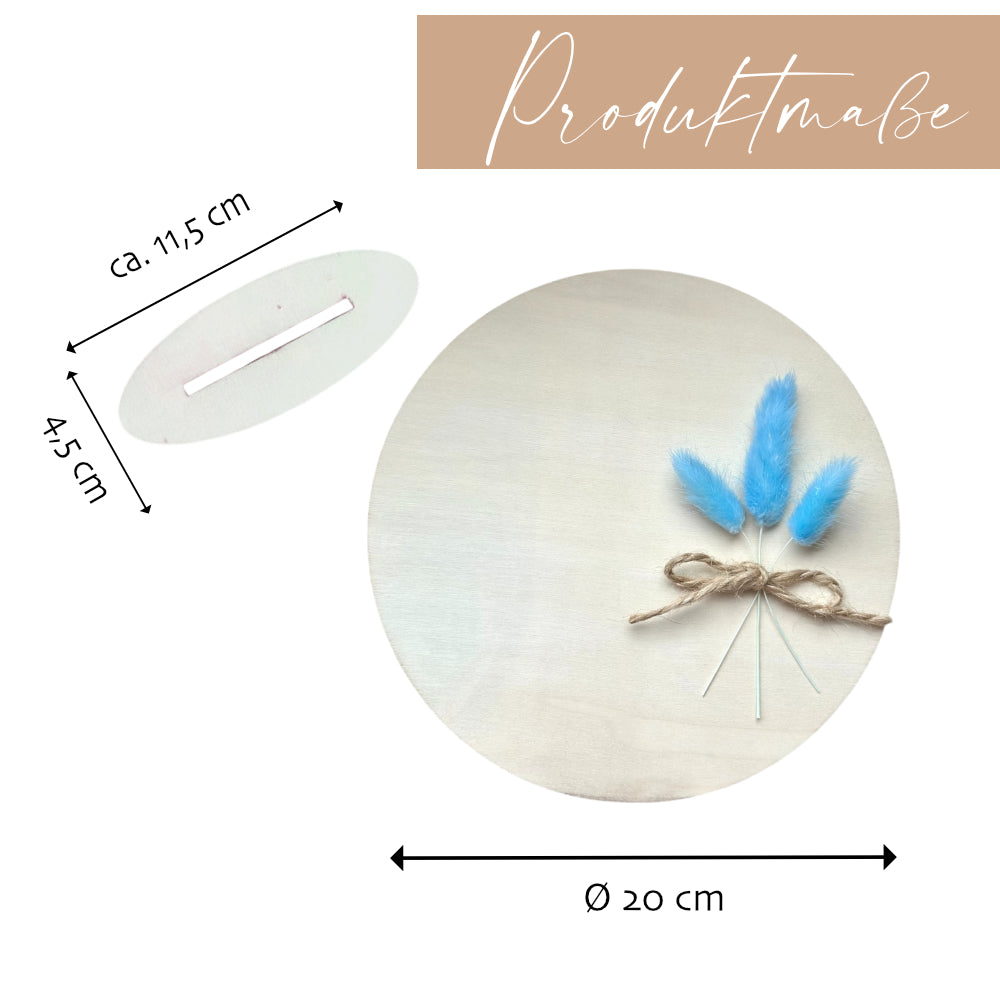 - Trockenblumen: Wähle zwischen rosa oder blauen Puschel mit einem liebevollen Juteband