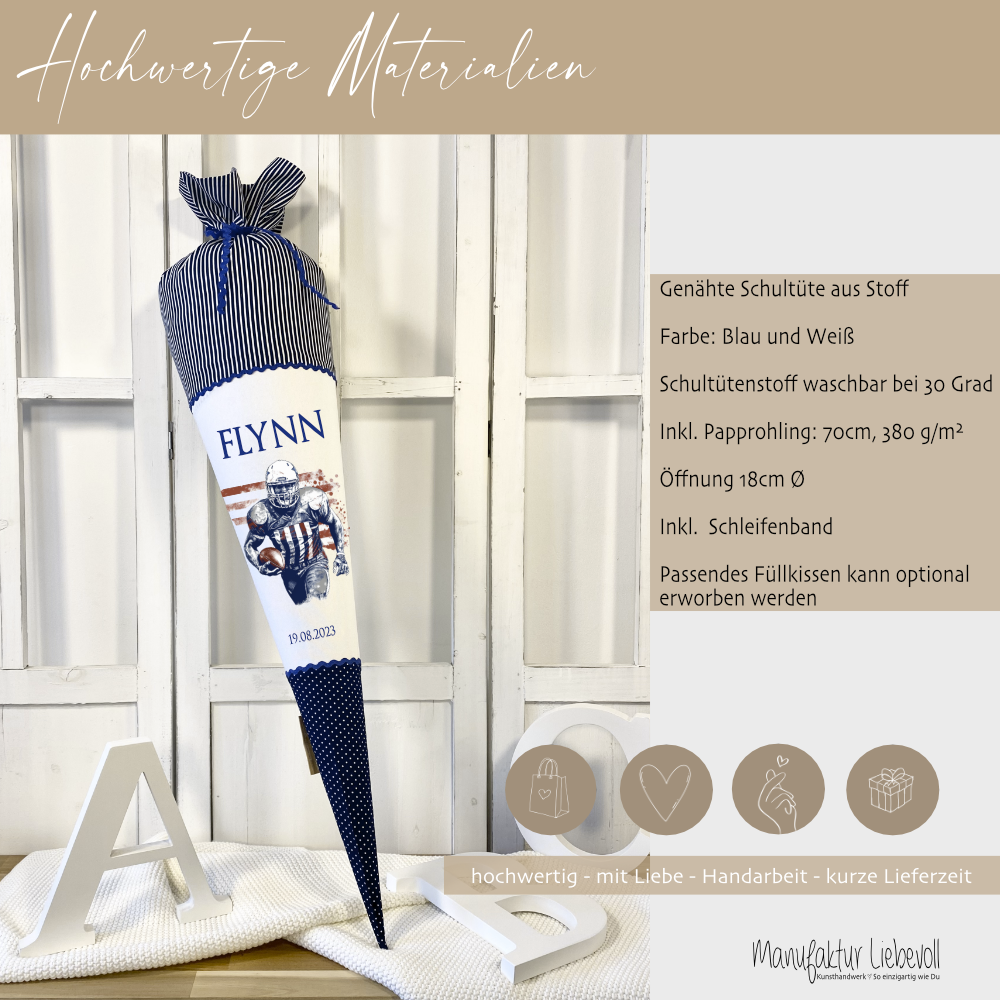 Super coole personalisierte Football Stoff Schultüte für Jungen zur Einschulung. Die handgenähte Zuckertüte wird mit dem Namen des Schulkindes und dem Einschulungsdatum individuell angefertigt. Die Einschulungstüte ist die trendige Geschenkidee für Kinder die Sport lieben zur Einschulung und eine langlebige Erinnerung an dieses so besondere Ereignis.