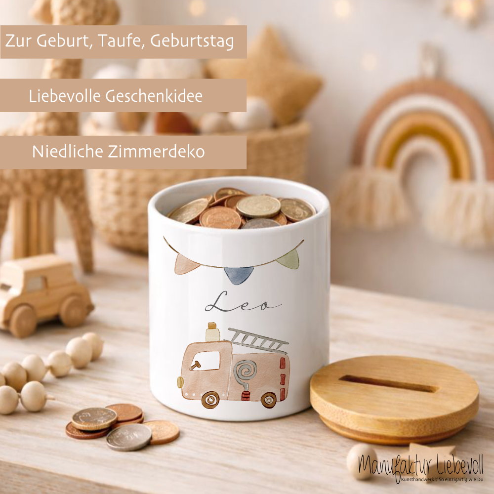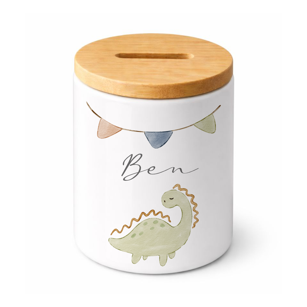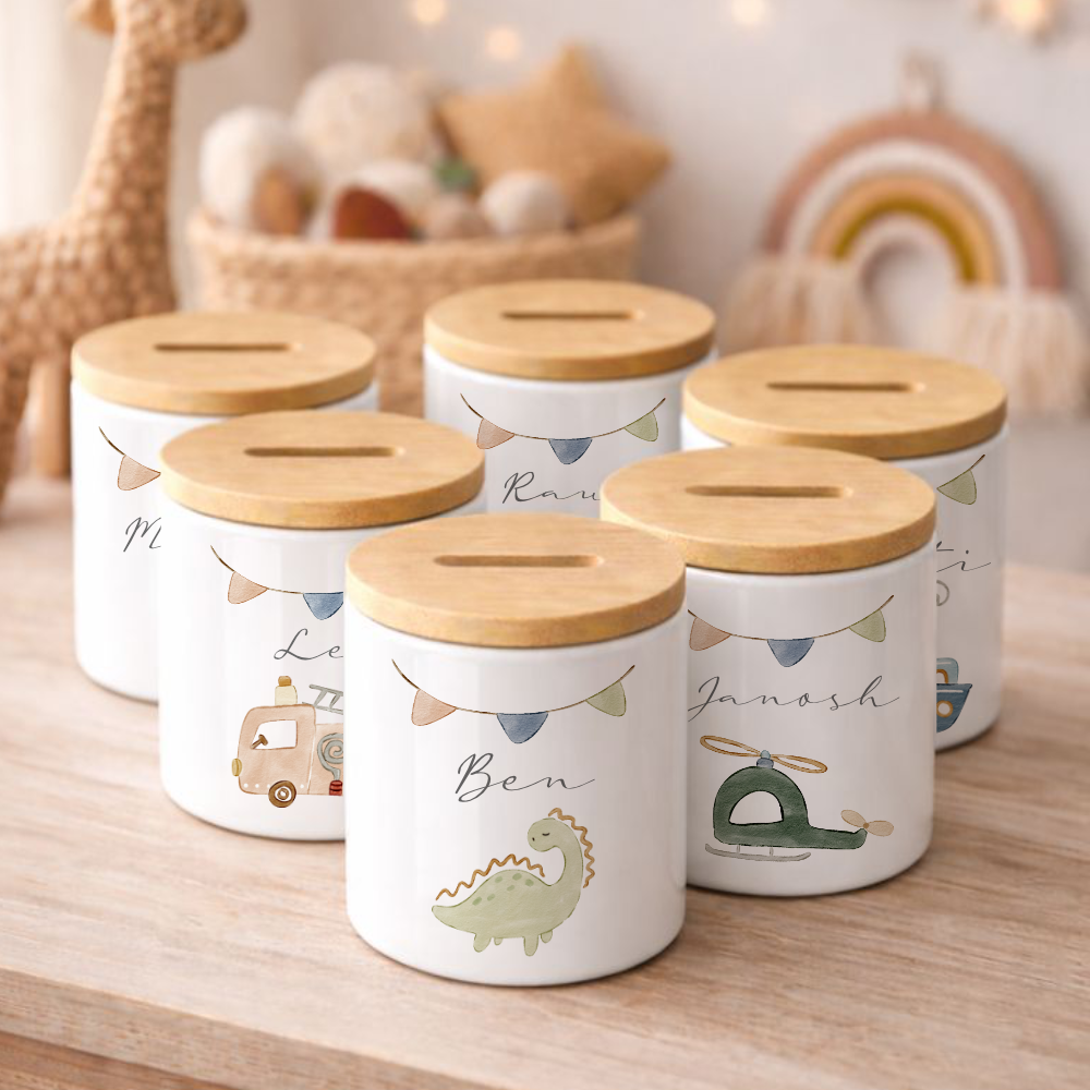 Diese personalisierte Kinderspardose ist ein liebevolles Geschenk für Kinder, die Fahrzeuge lieben oder kleine Dino-Fans sind. Mit dem individuellen Namen und einem der kindgerechten Motive wird jede Spardose zu einem ganz persönlichen Begleiter fürs erste Taschengeld.