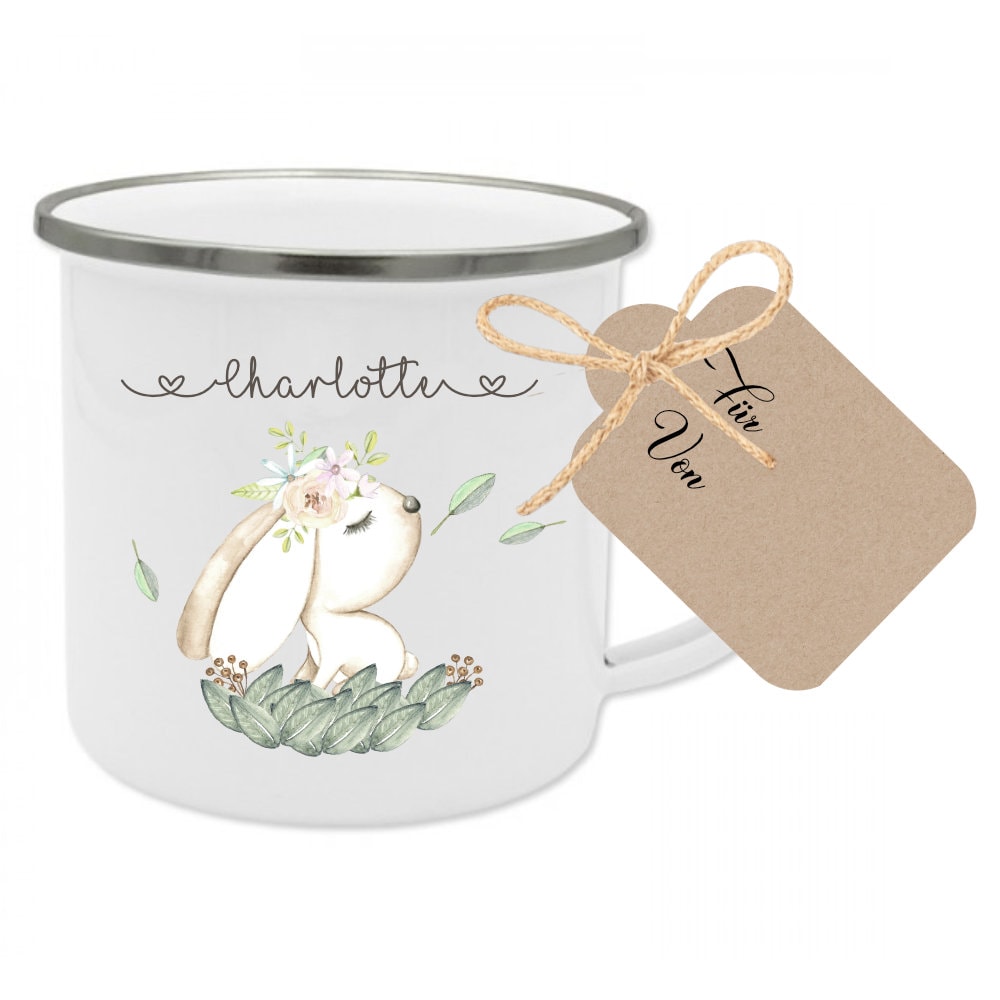 Das niedliche Reh wird beidseitig auf die Tasse kreiert. Der Name des Kindes wird in geschwungener Schrift im oberen Bereich der Emailletasse gestaltet.