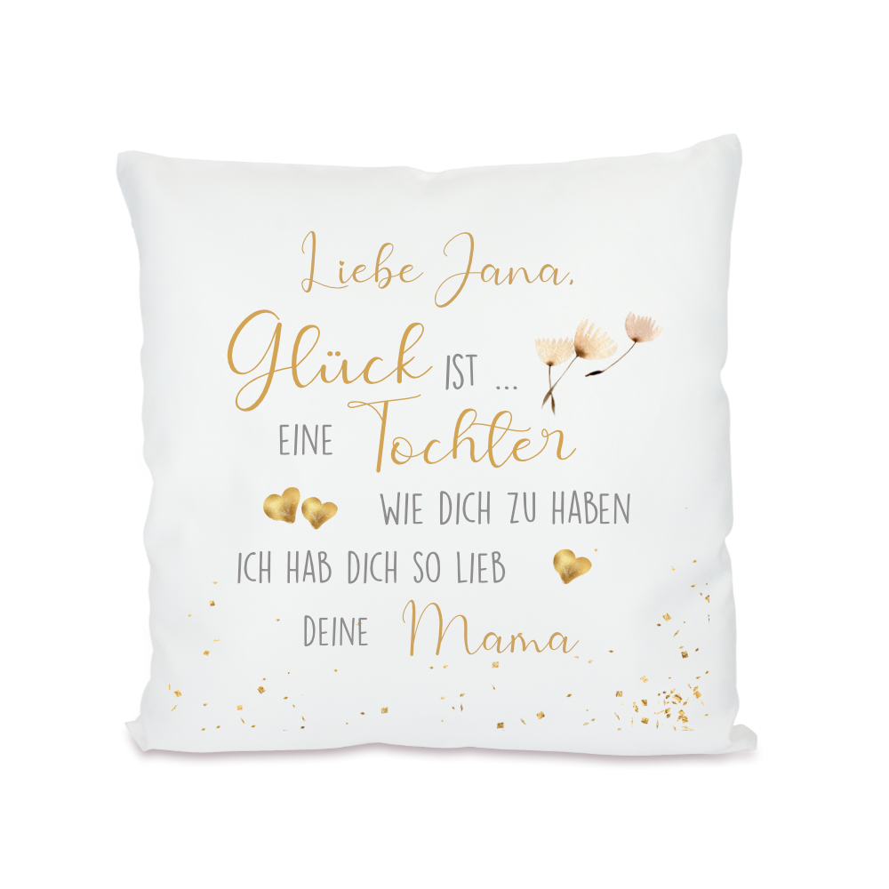 Das Kissen mit dem liebevollen Spruch: "Glück ist eine Tochter wie dich zu haben. Ich hab dich so lieb deine Mama" kann mit dem Namen der Tochter beschriftet werden. So wird es zu einem einzigartigen persönlichen Geschenk mit liebevoller Botschaft. Es ist ein zauberhaftes Geschenk von der Mutter für die Tochter, das berührt.
