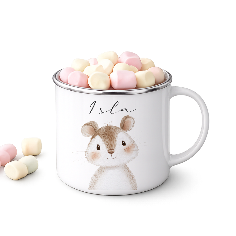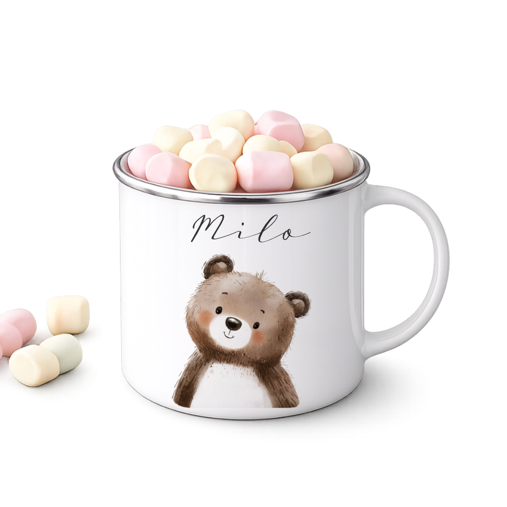 Diese liebevoll gestaltete Emaille-Tasse mit Tiermotiv und Wunschname wird schnell zum Lieblingsbecher kleiner Tierfreunde.