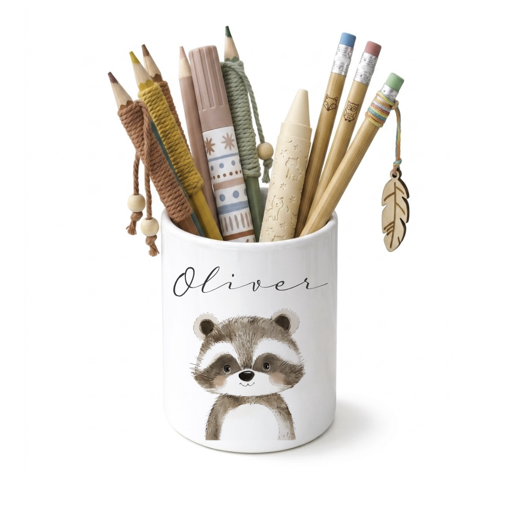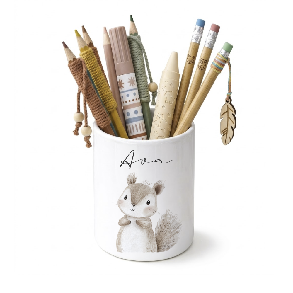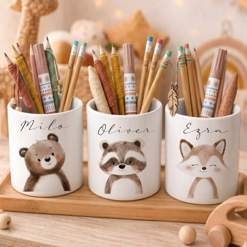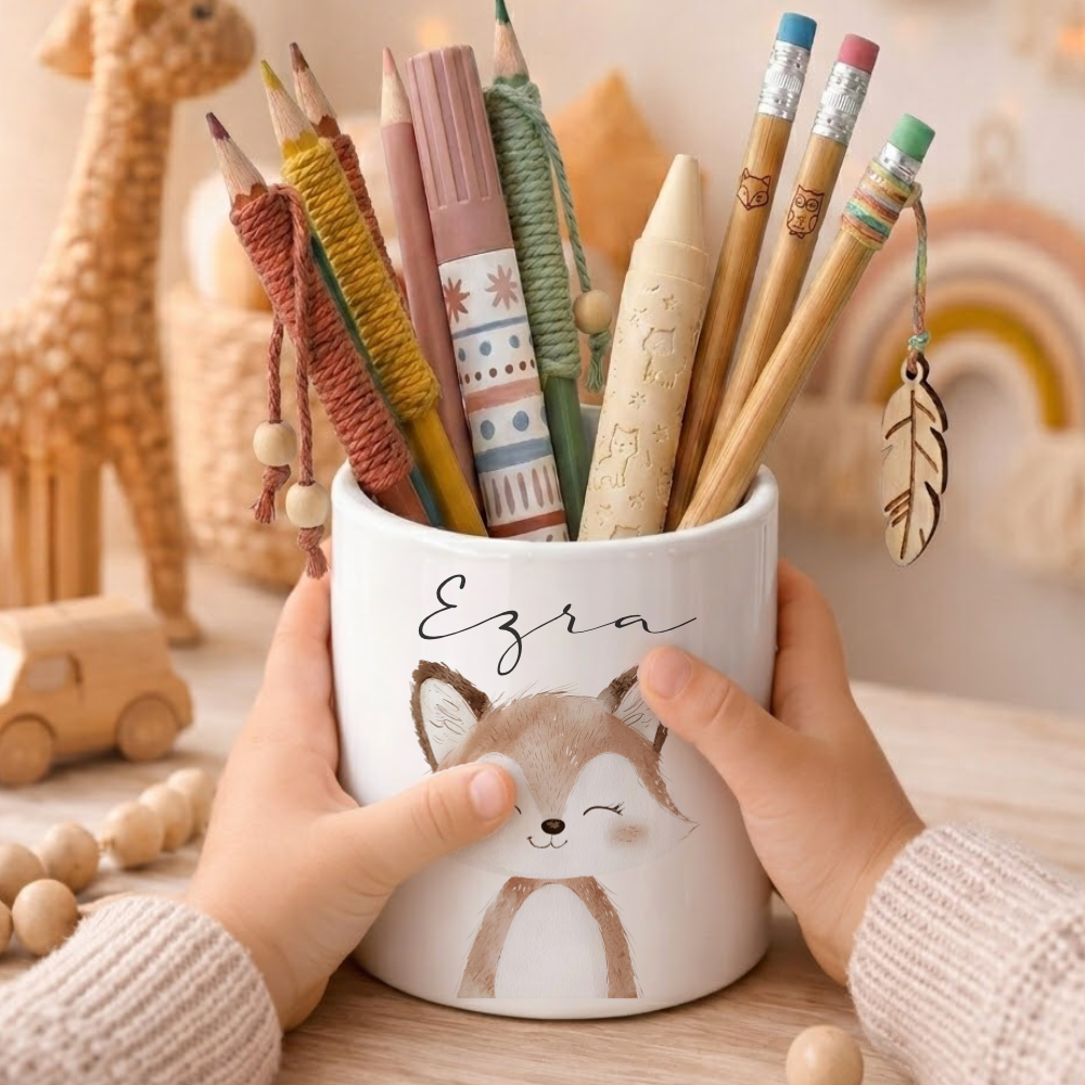 Schluss mit dem Stifte-Chaos! Unser personalisierter Stiftehalter aus hochwertiger Keramik bringt Ordnung und Stil in jedes Kinderzimmer. Ob für die ersten Hausaufgaben in der Grundschule oder zum Malen im Kindergarten – mit dem eigenen Namen und den liebevollen Waldtier-Motiven macht das Aufräumen endlich Spaß.