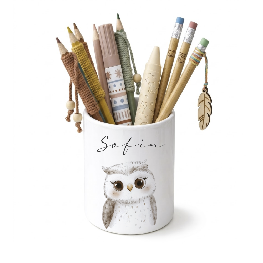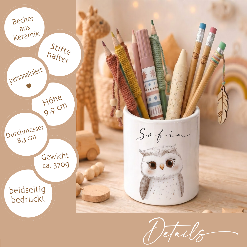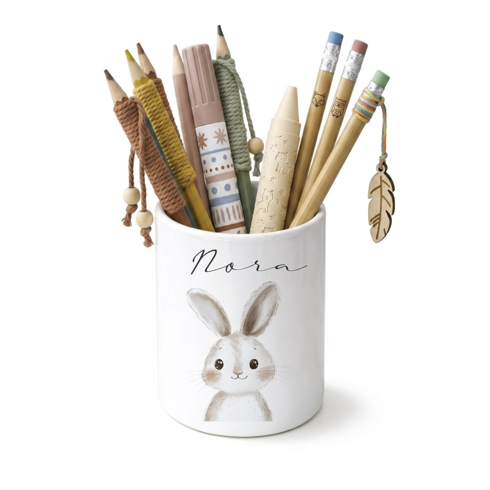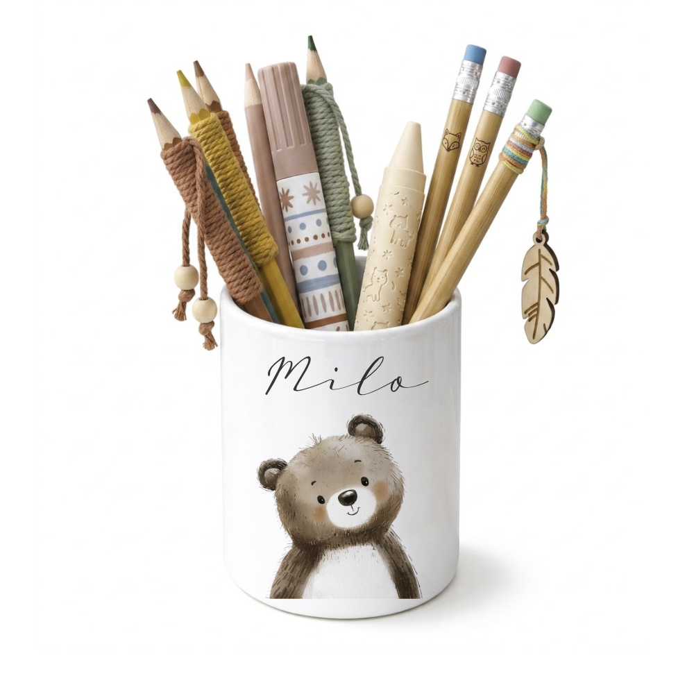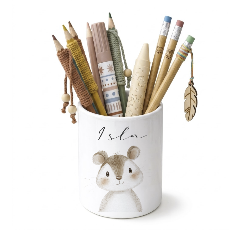 Schluss mit dem Stifte-Chaos! Unser personalisierter Stiftehalter aus hochwertiger Keramik bringt Ordnung und Stil in jedes Kinderzimmer. Ob für die ersten Hausaufgaben in der Grundschule oder zum Malen im Kindergarten – mit dem eigenen Namen und den liebevollen Waldtier-Motiven macht das Aufräumen endlich Spaß.