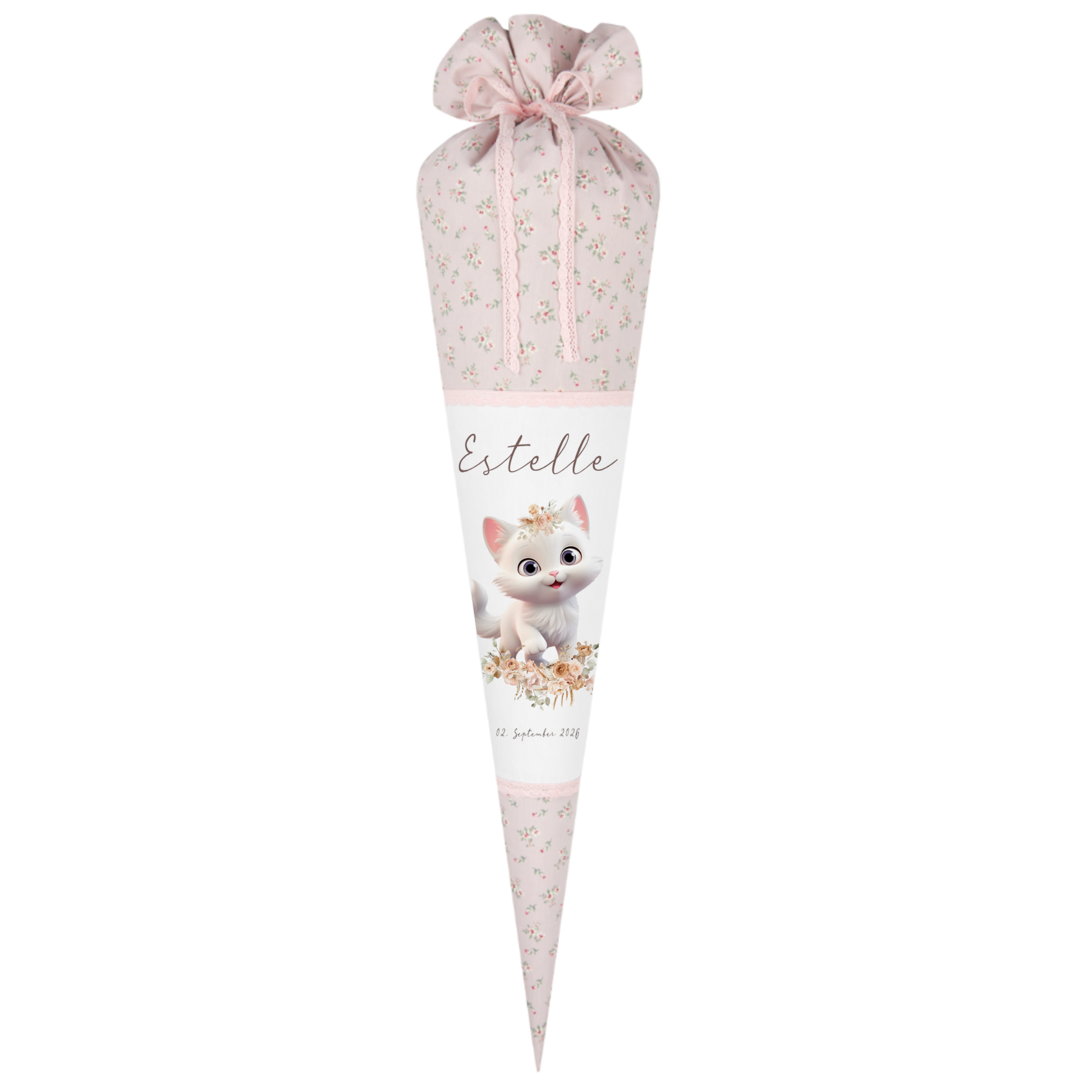 Wundervolle personalisierte rosa geblümte Stoff-Schultüte mit süßer Katze für Mädchen zur Einschulung. Sie sind die einzigartige Zuckertüte mit Namen und Datum für Katzen-Fans zur Einschulung und eine wundervolle Erinnerung an diesen einzigartigen Tag.
