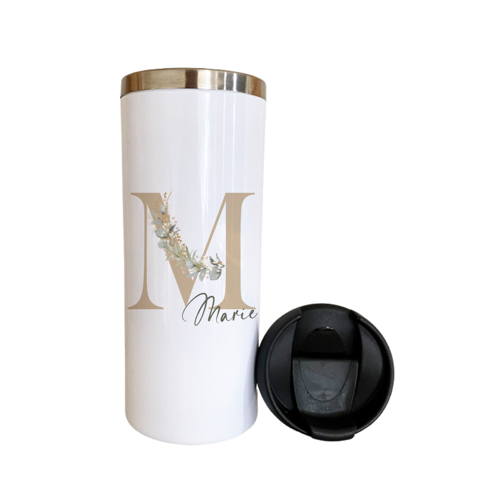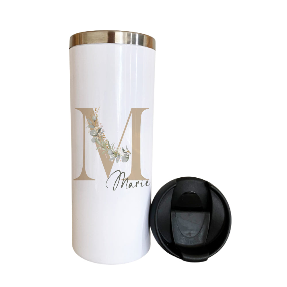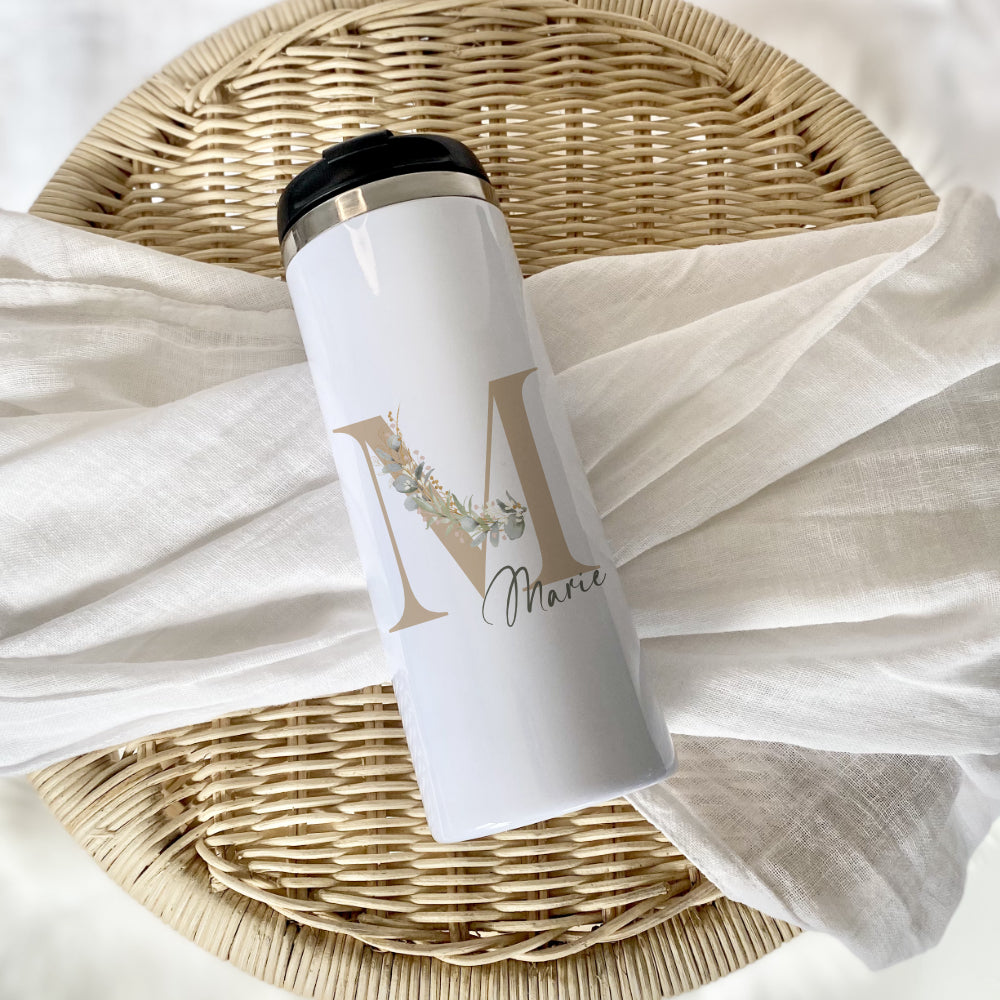 Liebevoll designter Thermobecher mit Deckel für den Kaffee to Go. Der Trinkbecher wird mit dem Namen, Buchstaben und Eukalyptus gestaltet. Der Thermobecher ist ein praktischer Alltagsbegleiter und eine personalisierte Geschenkidee zu verschiedenen Anlässen.