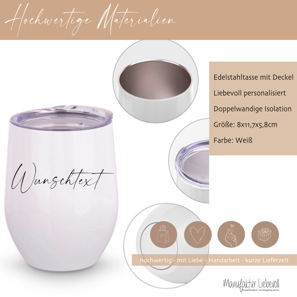Edelstahlbecher mit Deckel, liebevoll personalisiert, Doppelwandige Isolation, Größe: 8 x 11,7 x 5,8 cm, Gewicht: ca. 200g, Fassungsvermögen ca. 350ml, Farbe: Weiß
