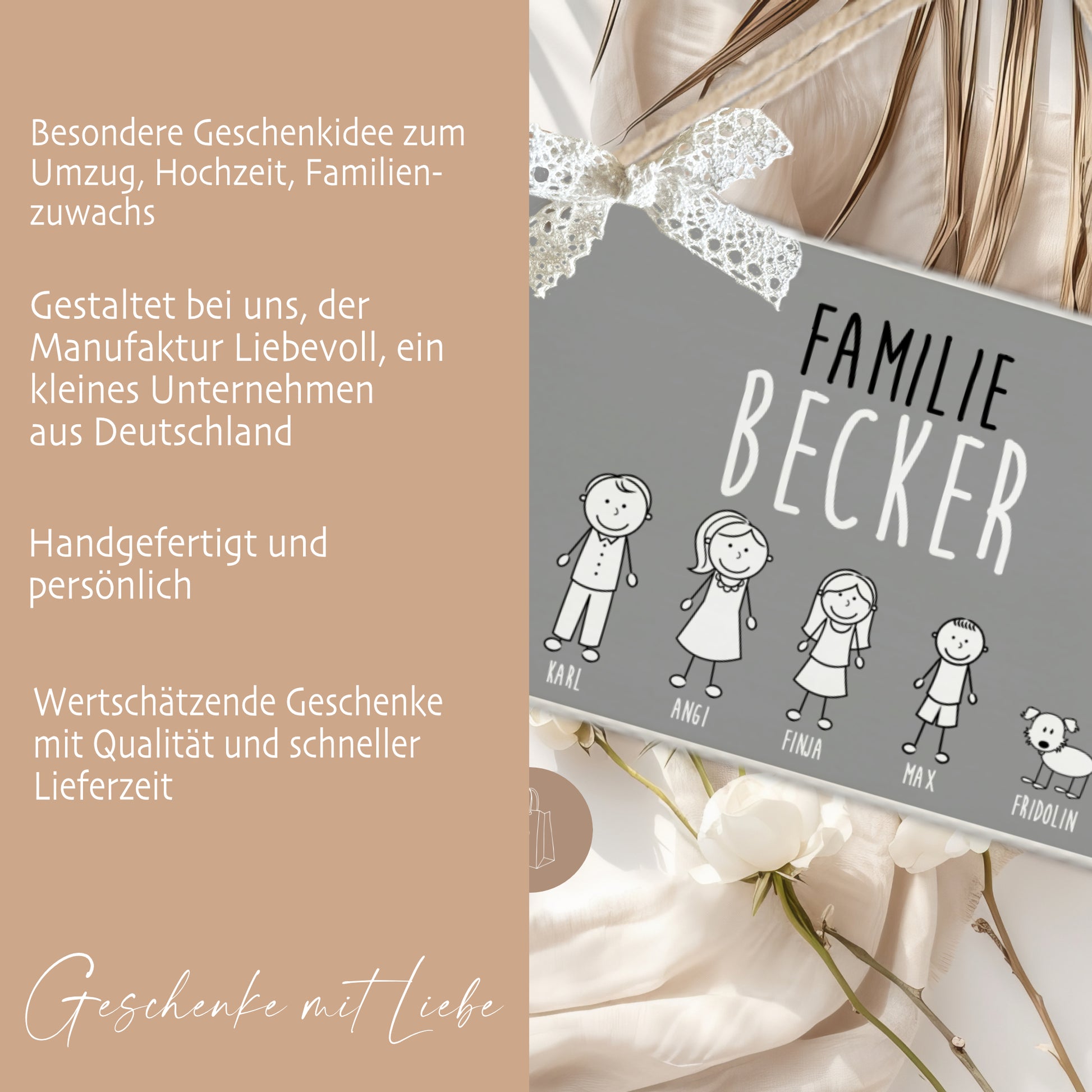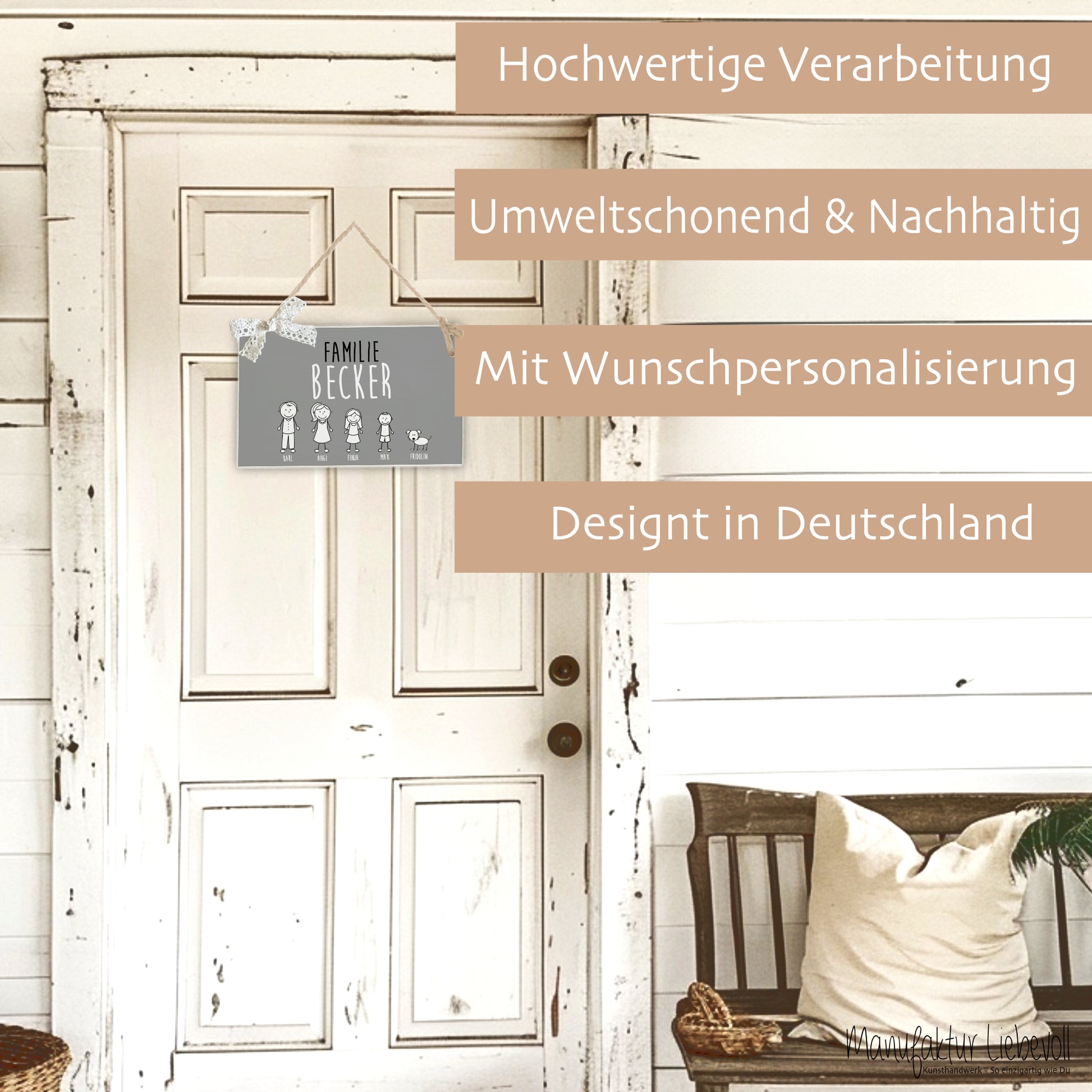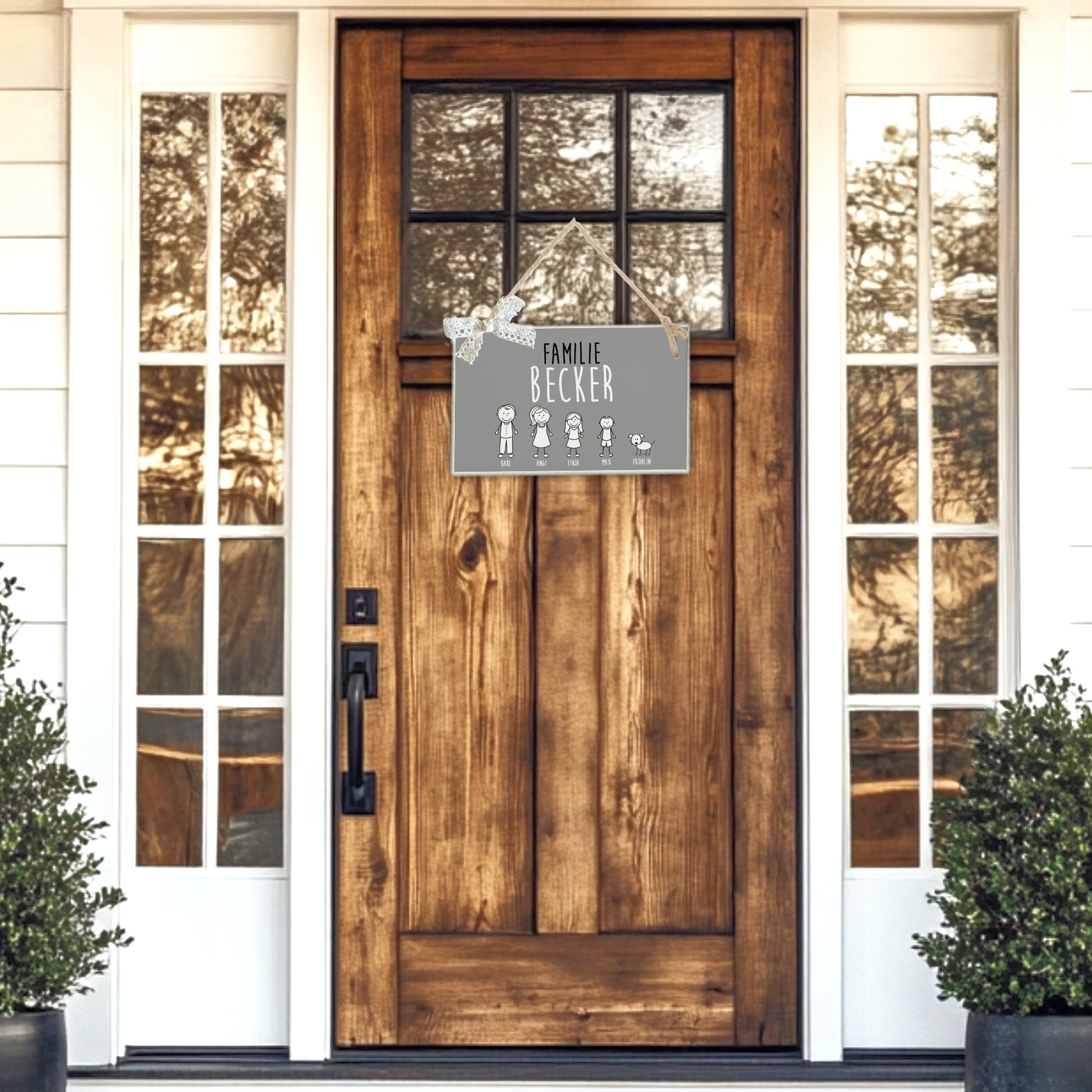 Jedes Türschild wird mit dem Wort „Familie“ angefertigt. Sollte dies nicht gewünscht sein, schreibe den Hinweis unbedingt mit in das Personalisierungsfeld (Bsp: Ohne das Wort Familie).
